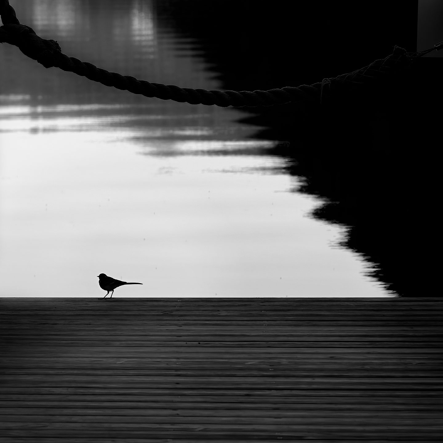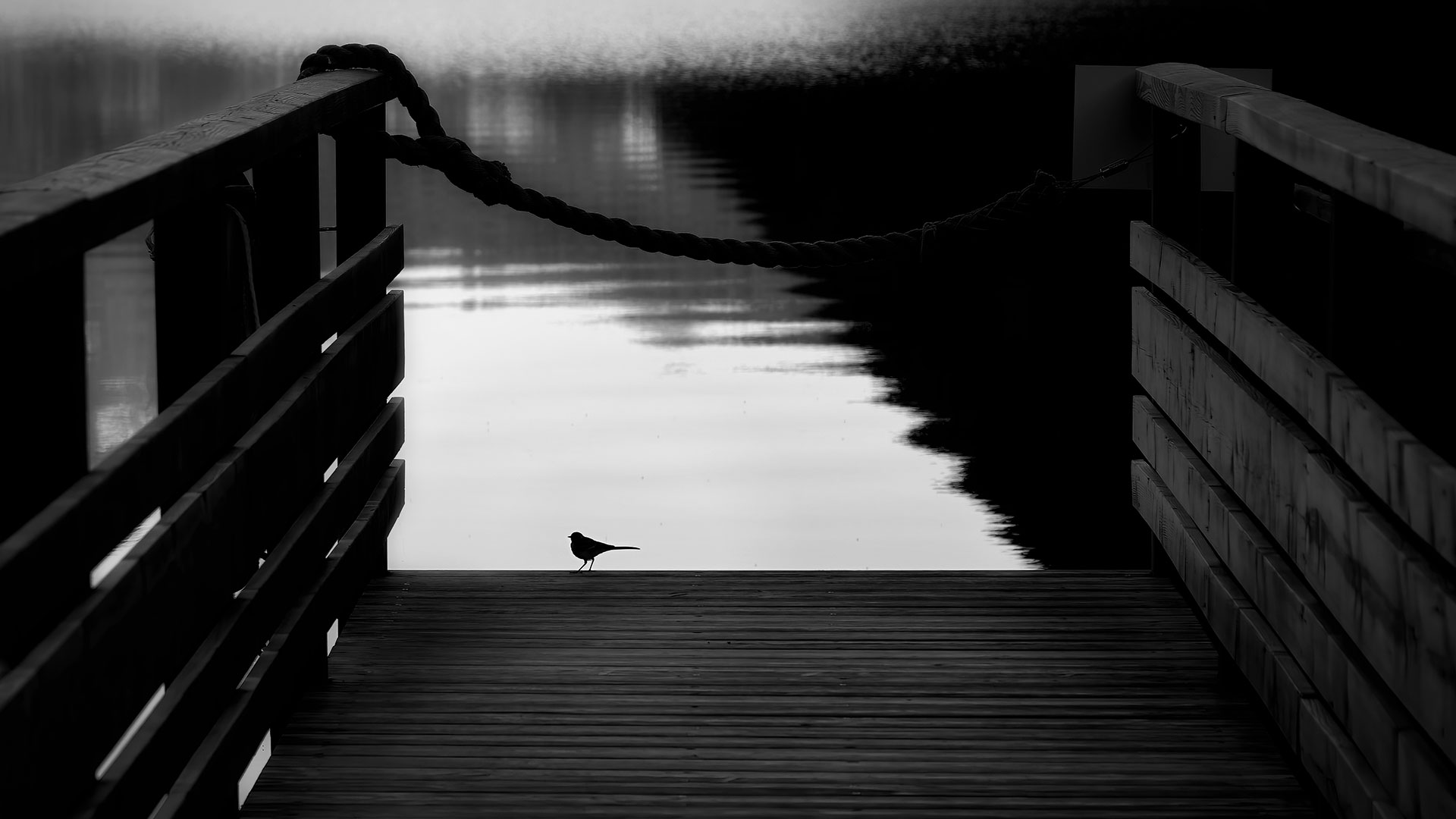 Wenn man sich an die Drittelteilung, Goldener Schnitt und eine richtige Belichtung hält, entsteht ein ordentliches Foto aber noch lange kein WOW Bild. Die Zutaten zum WOW sind aber bekannt. Licht, Brennweite, Perspektive und Bildkomposition mit einer klaren Aussage, die beim Betrachter Emotionen auslöst. Fertig ist das WOW Bild. Das unterhalb angeführte Foto zeigt eine Gegenlichtsituation mit wenig Kantenlicht am Seil und eine Verstärkung durch dezentes Abwedeln und Nachbelichten (Dodge and Burn) im Bereich des Steges. Diese Technik bringt mehr 3D in ein zweidimensionales Bild. Der Minimalismus in der Bildkomposition. Obwohl der Vogel nichteinmal ein Prozent des Bildes ausmacht ist er klar als Hauptmotiv erkennbar. Die Negativräume im Bild die keine Strukturinformation beinhalten (schwarze und weiße Flächen) verstärken den Scherenschnitt des Vogels.